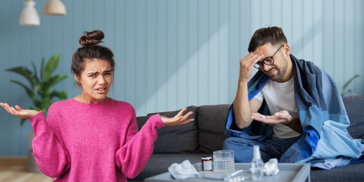 We’ve all seen it: a guy rugged up on the couch feeling sorry for himself while his sick partner works from home, does chores, and looks after him.